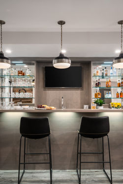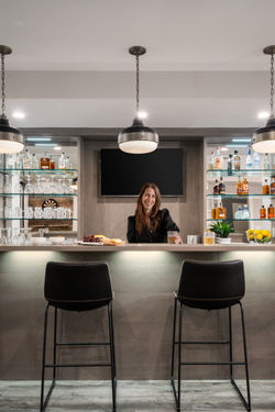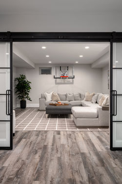 Discover the ultimate entertainment haven! This stunning basement design features a custom swanky bar with captivating lighting and intricate details, a handcrafted gaming table by a master carpenter, and a cozy movie viewing area with an oversized, ultra-comfortable sectional. A sleek ping-pong table, custom dart board, and drink ledge with custom made art by Lemon Drop Design adds the perfect touch of fun to this luxurious, multifunctional retreat.